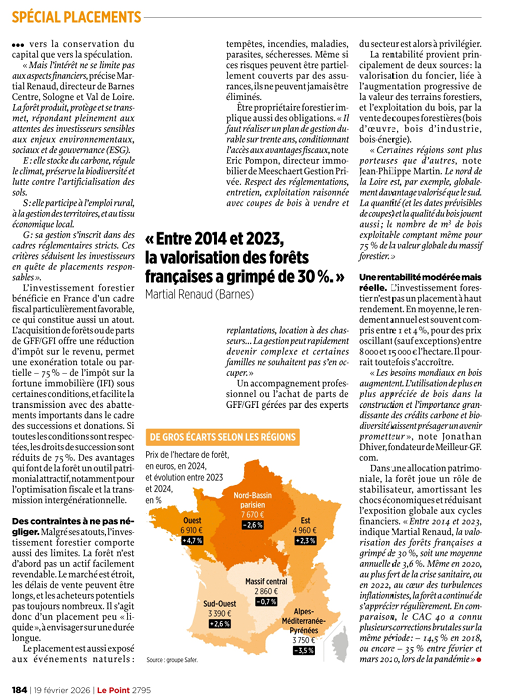 Dans son édition du 19 février, Le Point consacre un article à l’investissement forestier et cite Jean-Philippe Martin, Directeur Général de FIDUCIAL Gérance, interviewé pour la circonstance.
